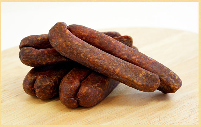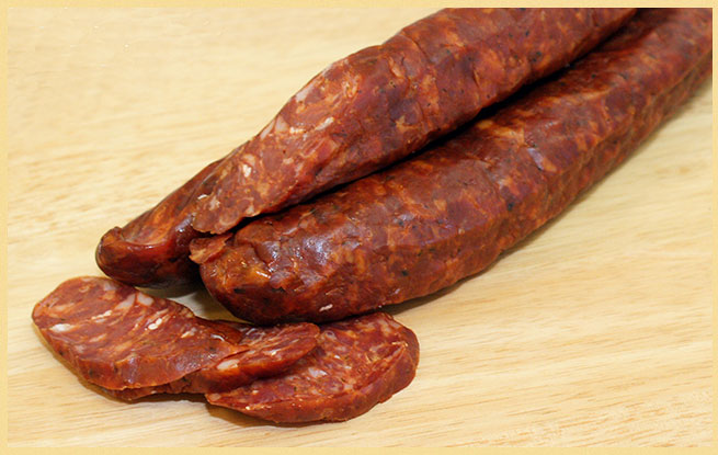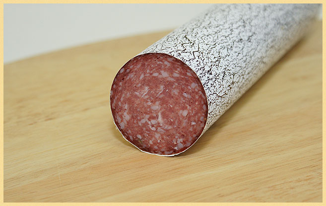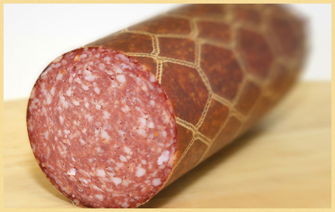 Elaborado con 40% de carne vacuna, 40% de carne de cerdo y 20% de tocino. Especie de salamín fuertemente ahumado y seco Presentación: venta por pares